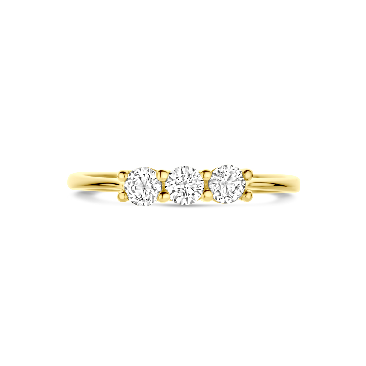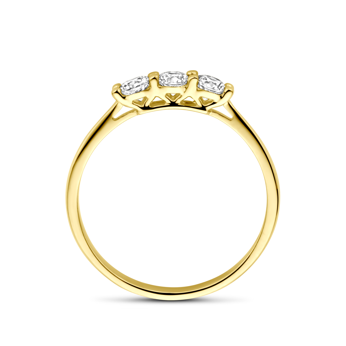 14krt. Geelgouden ring uitgevoerd met 3 zirkonia's. De stenen hebben een diameter van 3,5mm.