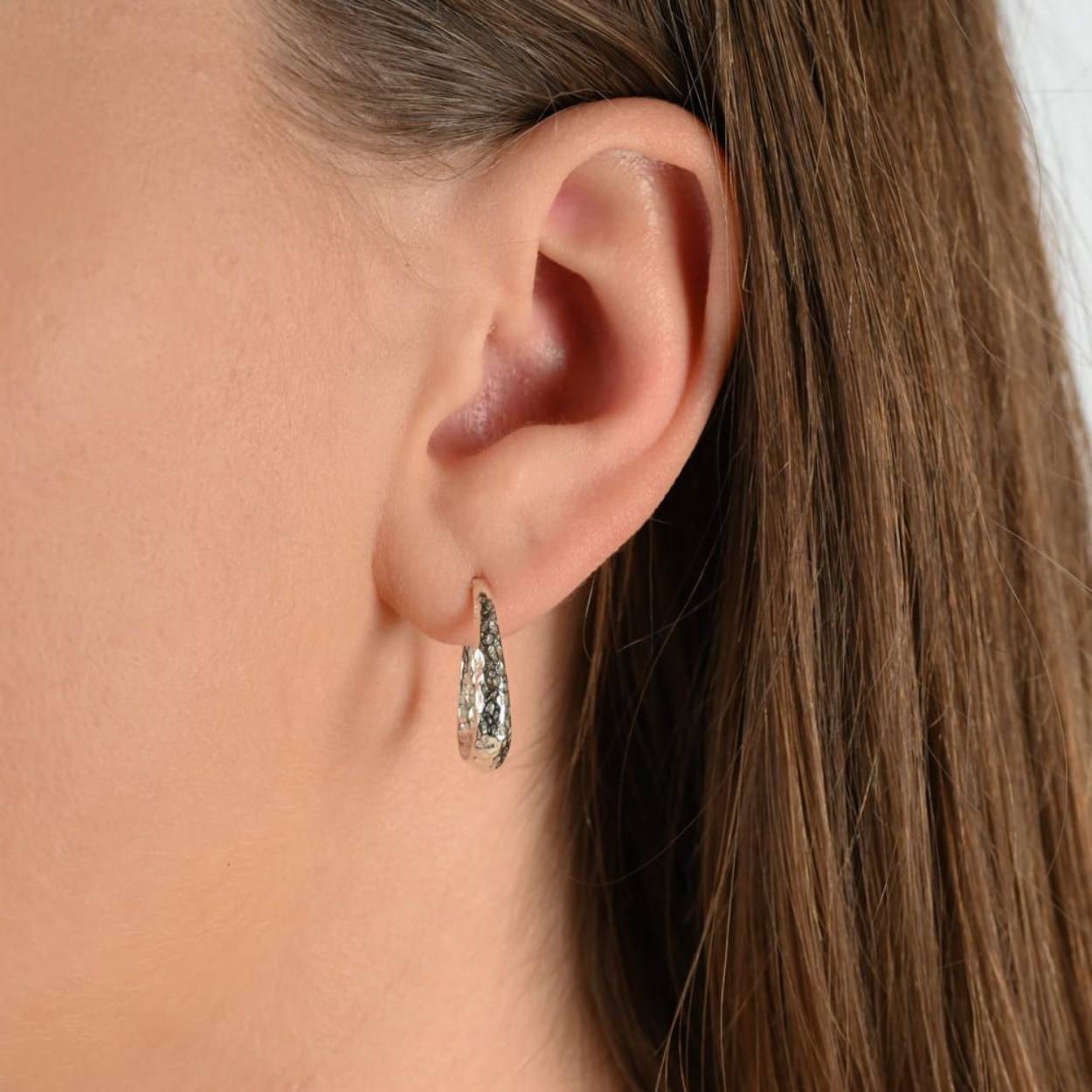 Oor creool gemaakt van 925 sterling zilver in combinatie met hamerslag. Deze oorbellen zijn perfect te combineren met de andere sieraden van Jéh Jewels.