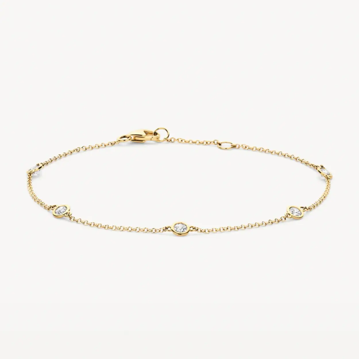 Glinsterende zirkonia in gladomzetting (3,4 mm) en 14k geelgoud maken van deze armband een geraffineerde blikvanger. De band is 18 cm lang en heeft een karabijnsluiting. Mooi op zichzelf of mix en match met andere armbanden uit onze collectie, bijvoorbeeld met collier 3172YZI.