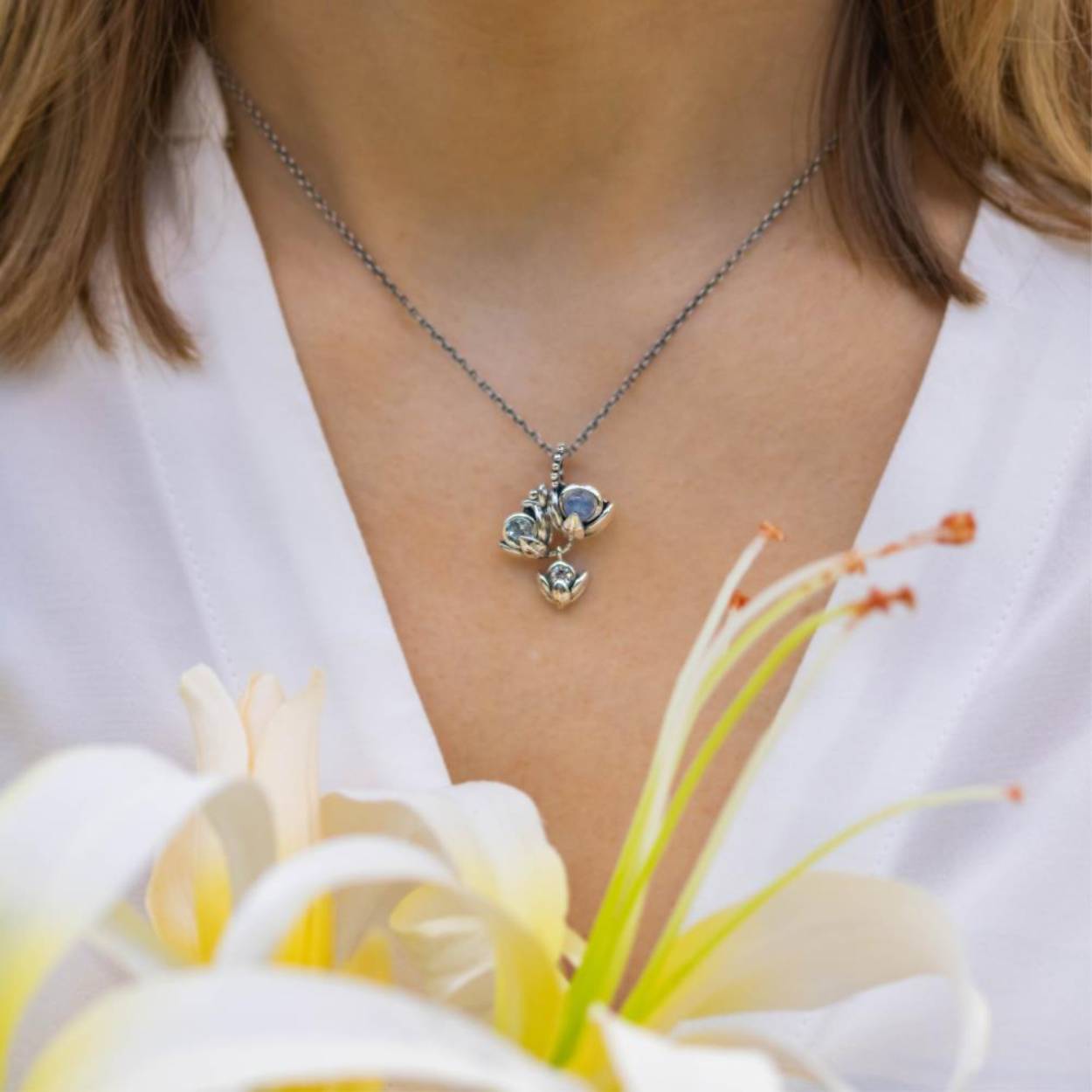 Deze sterling zilveren collier heeft een prachtige hanger met een 5 mm maansteen, een 4 mm gefacetteerde blauwe topaas en 3mm zirkonia. Het collier kan op 42 en 45 cm gedragen worden.