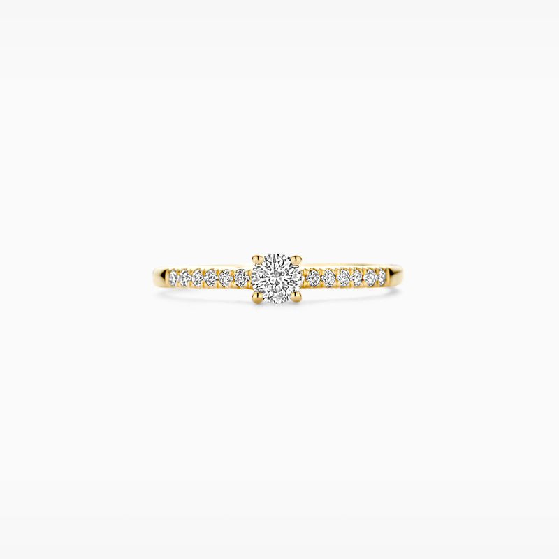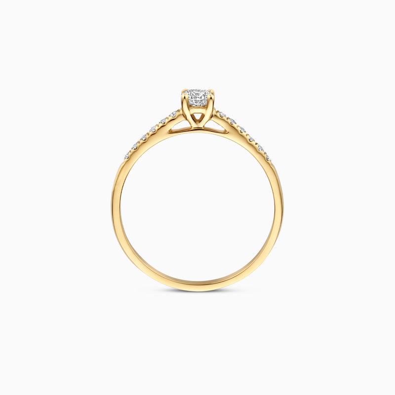 Deze schitterende 14k geelgouden ring is bezet met lab-diamonds in chaton- en pavé-zetting. Het totale karaatgewicht van de diamanten is 0,32, de doorsnede van de ring is 1,5 mm. Stijlvol op zichzelf of gecombineerd met andere sieraden met lab-diamonds uit onze collectie.