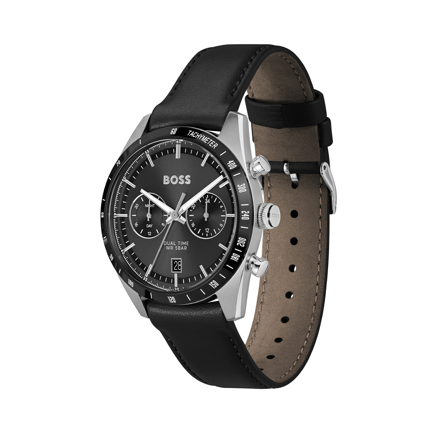 Dit BOSS horloge uit de TOURMASTER serie met artikelnr: HB1514284 heeft een luxe sportieve uitstraling. Meer dan een horlogeaccessoire is dit horloge een symbool van sportieve luxe stijl en de sensatie van de tijd. Verrijk uw pols met een horloge dat de essentie van racen belichaamt, waar snelheid en verfijning samenkomen in een naadloze combinatie van vorm en functie. Dit herenhorloge valt op door zijn stalen horlogekast met een zwarte bezel met een tachymeter en zijn zwarte sunray wijzerplaat met dubbele tijdsaanduiding en een datum. Opvallend zijn de fijne wijzers, grijze subeyes en fijne uurstrepen. Aan de kast zit een zwarte lerenband met een gespsluiting. Het horloge heeft een doorsnee van 41mm met een mineraalglas en is 5ATM.