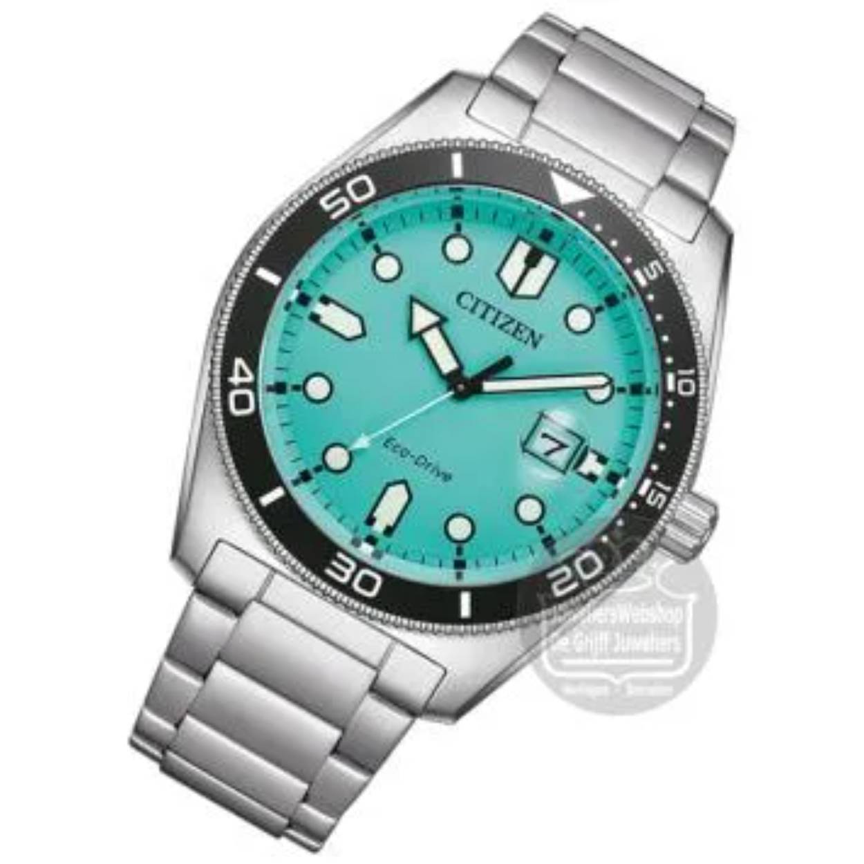 Deze solar duiker heeft een prachtige turquoise wijzerplaat en een datum vergrootglas. De frisse kleur en de waterdichtheid van 10 ATM maken het de perfecte metgezel voor de zomervakantie.