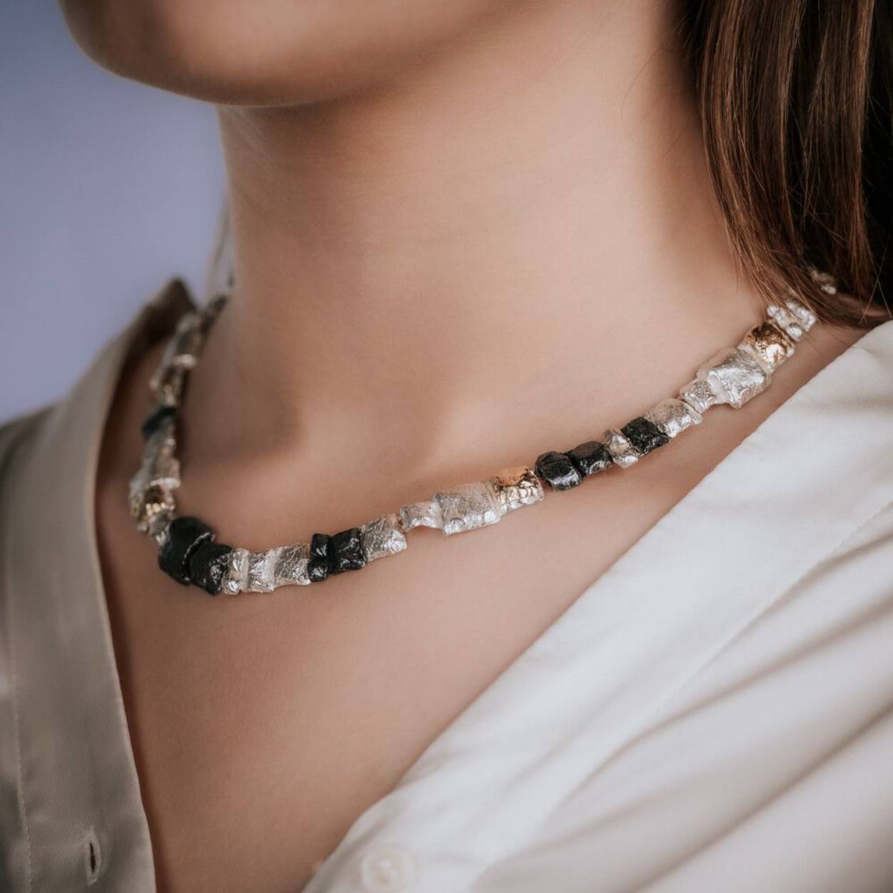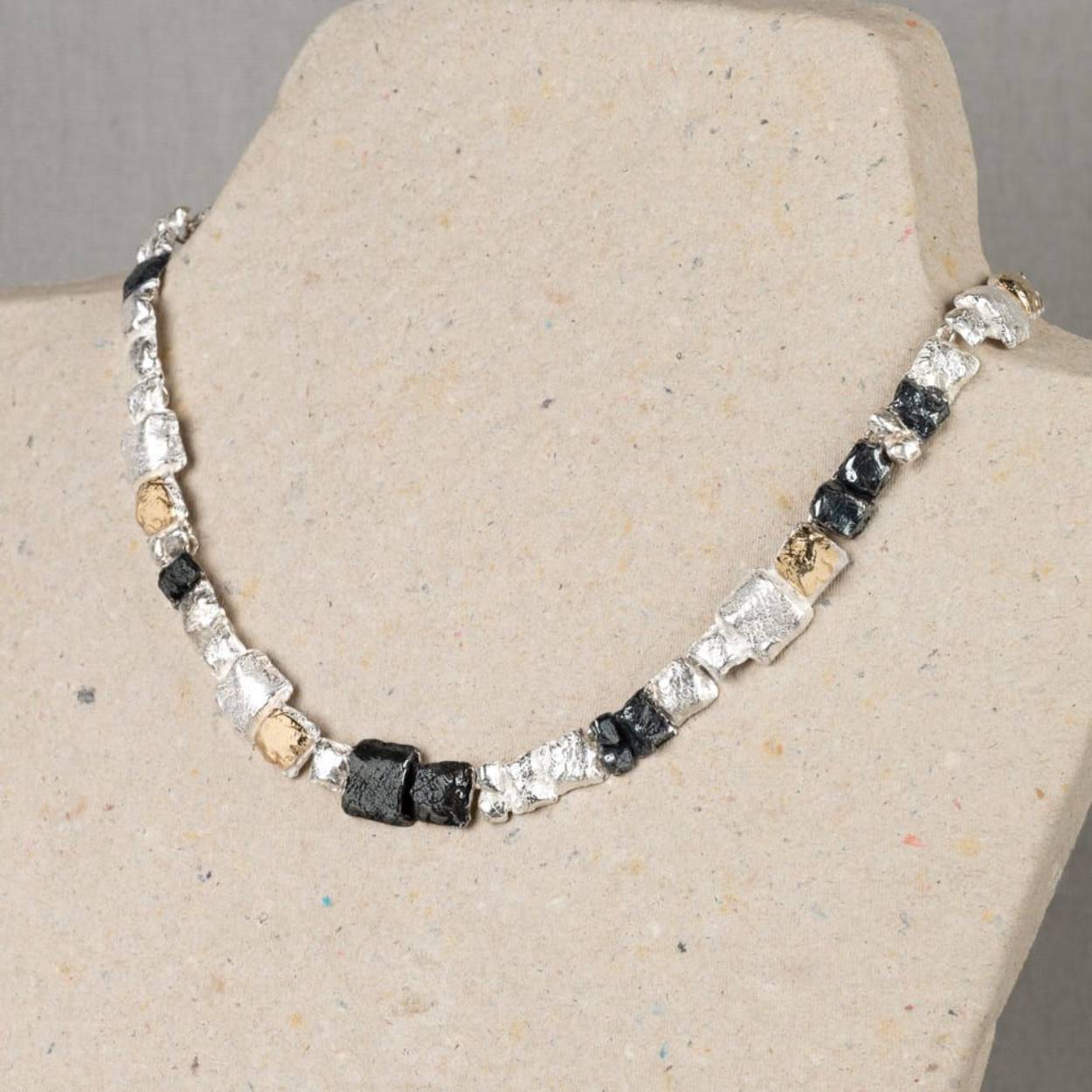 Dit collier is gemaakt van drie soorten zilver. Namelijk 925 sterling zilver, geoxideerd en verguld zilver. Door deze kleurencombinatie is dit collier makkelijk te verwerken in elke soort look.