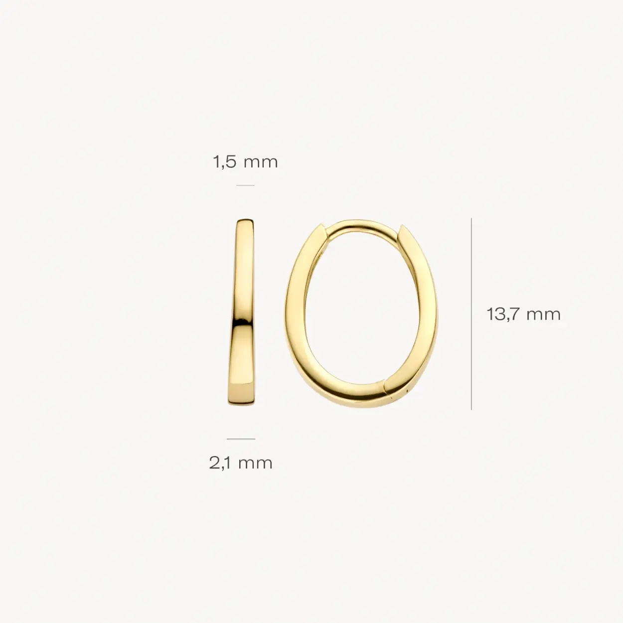 Deze eenvoudige, gladde, ovaalvormige 14k geelgouden oorringen zijn het summum van klassieke stijl. Ze hebben een lengte van 13,7 mm en zijn mooi te combineren met andere (oor)sieraden uit onze collectie.
