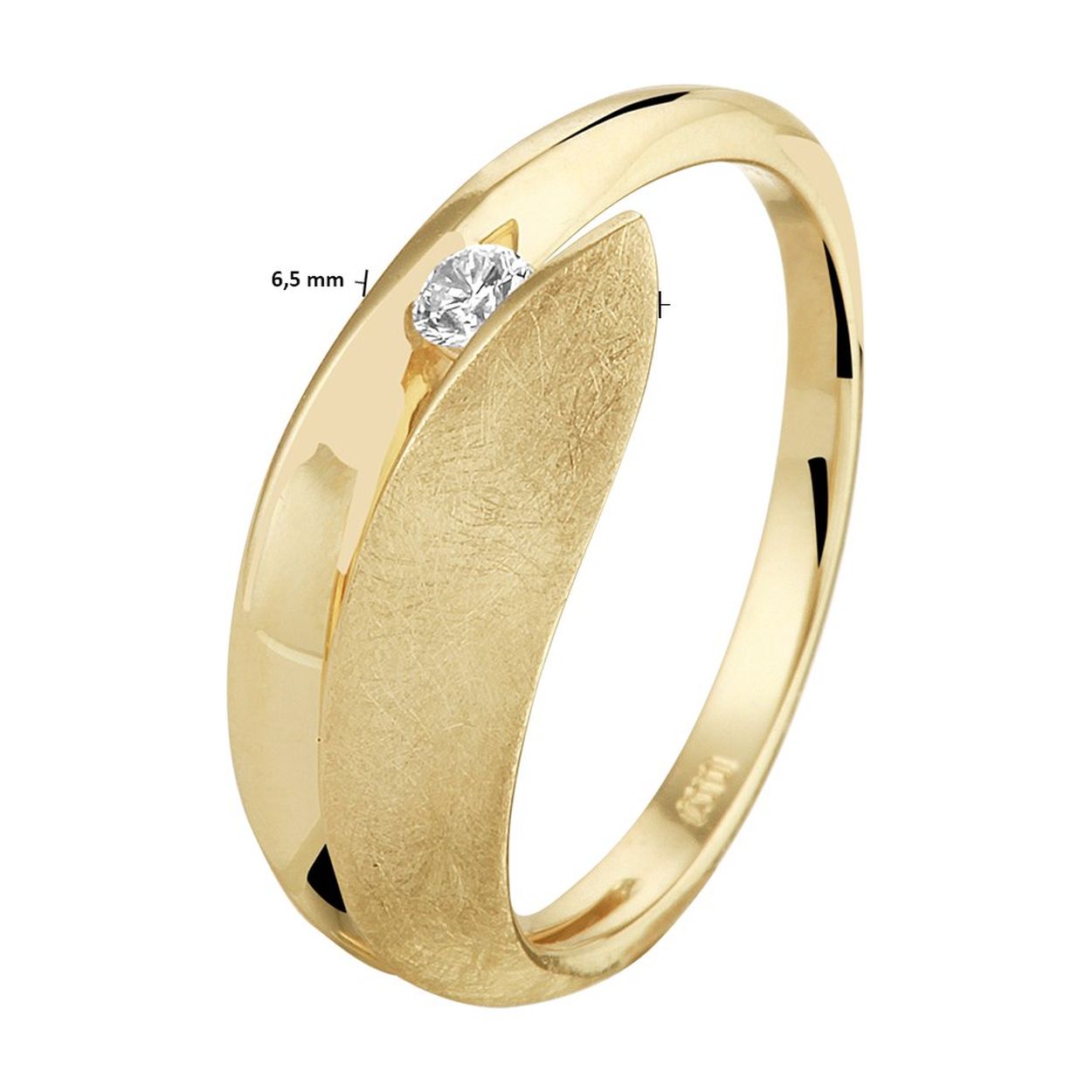 Geelgouden ring uitgevoerd in 14 karaat met een schitterende diamant, briljant geslepen. De ring heeft een breedte van 6.5mm.