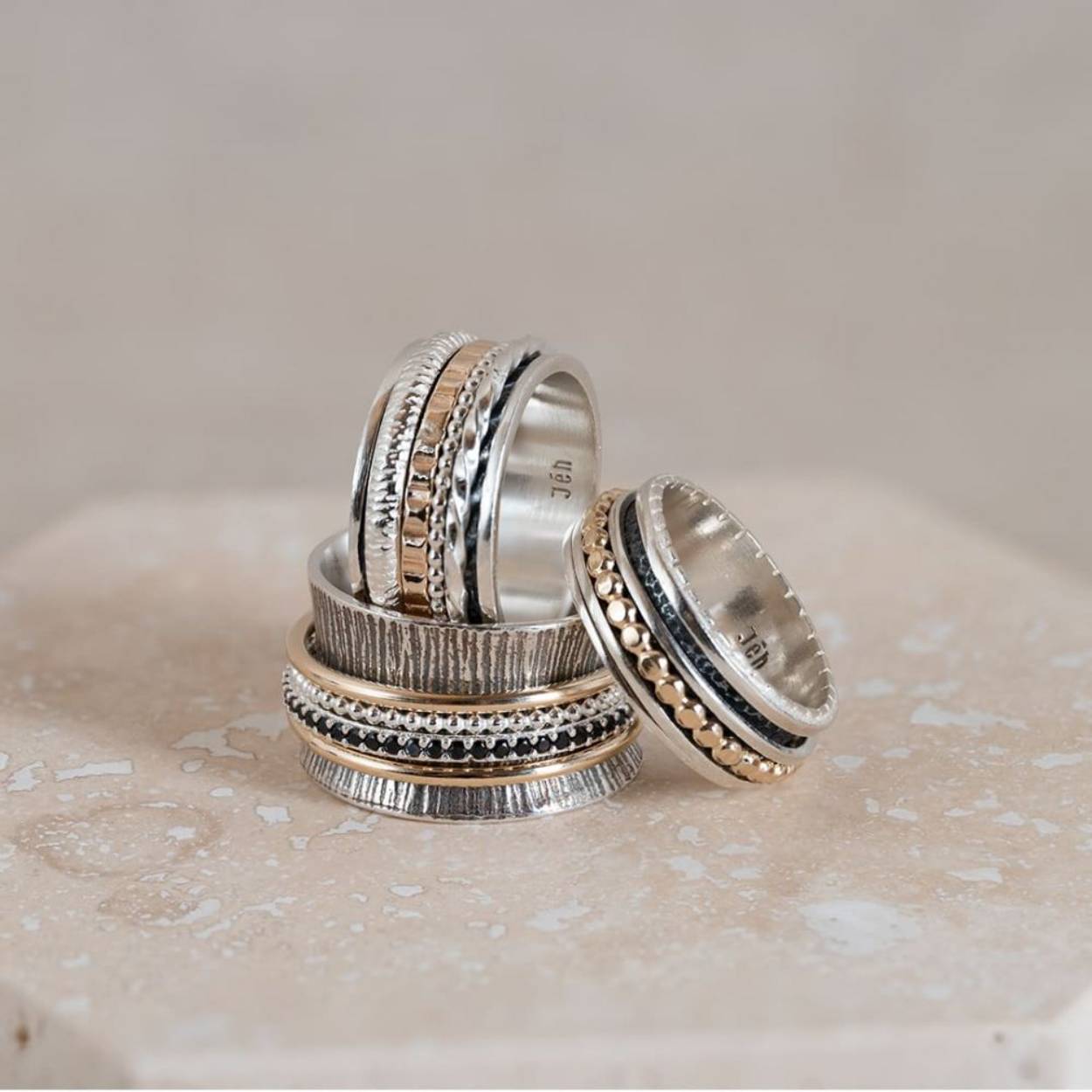 Bijzondere ring gemaakt van (geoxideerd) 925 sterling zilver en gold filled. De ringen in het midden van de ring kunnen bewegen, dit zorgt voor een speels effect. Onder de ring is gebruik gemaakt van geoxideerd zilver. Doordat de ringen speels bewegen, is het mogelijk dat de geoxideerde laag na verloop van tijd vervaagd.