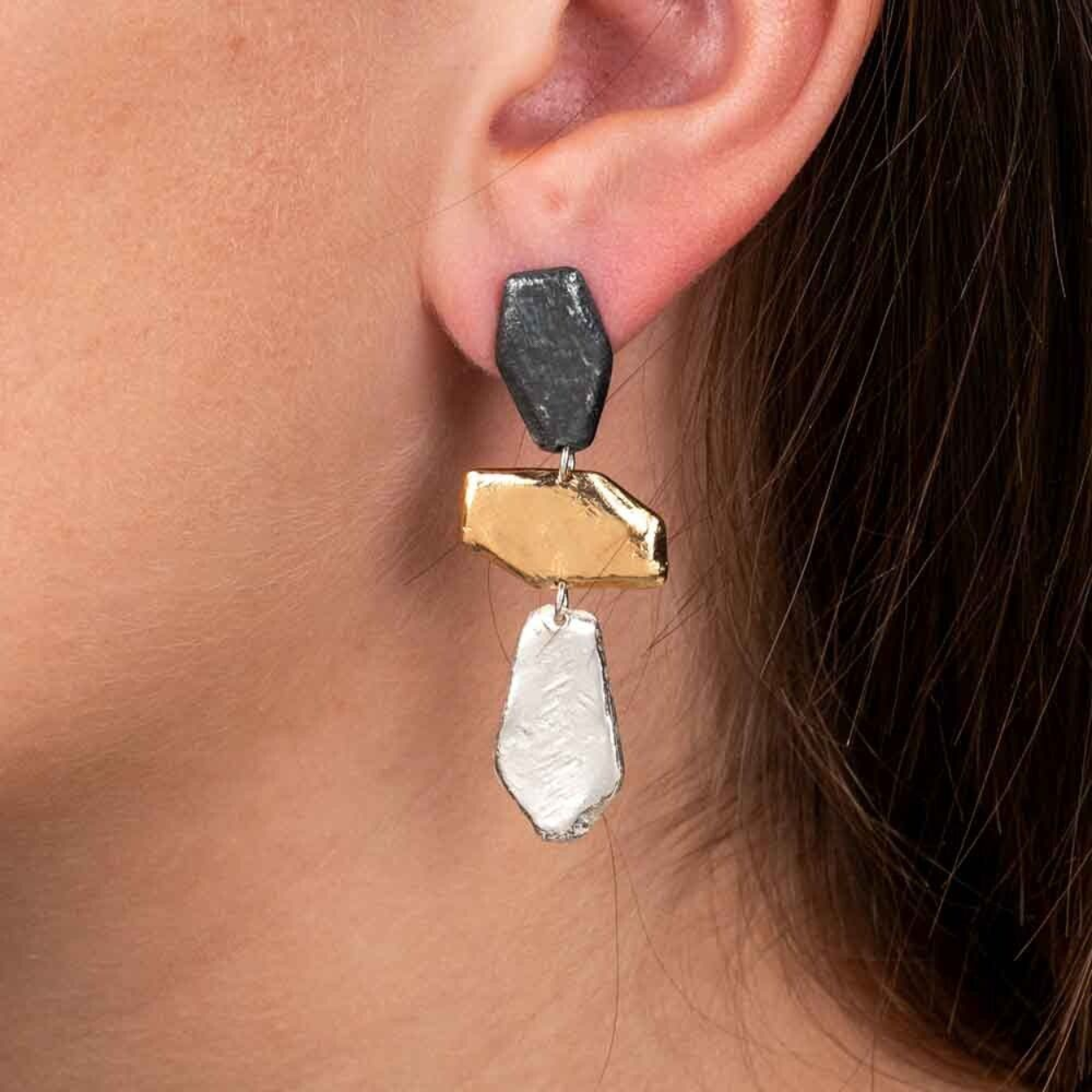 Oorbellen gemaakt van 3 materialen: 925 sterling zilver, geoxideerd zilver en verguld. Hierdoor krijgt dit sieraad 3 kleuren wat het speels en uniek maakt. Combineer met een mooi collier, een ring en armband voor een complete look!