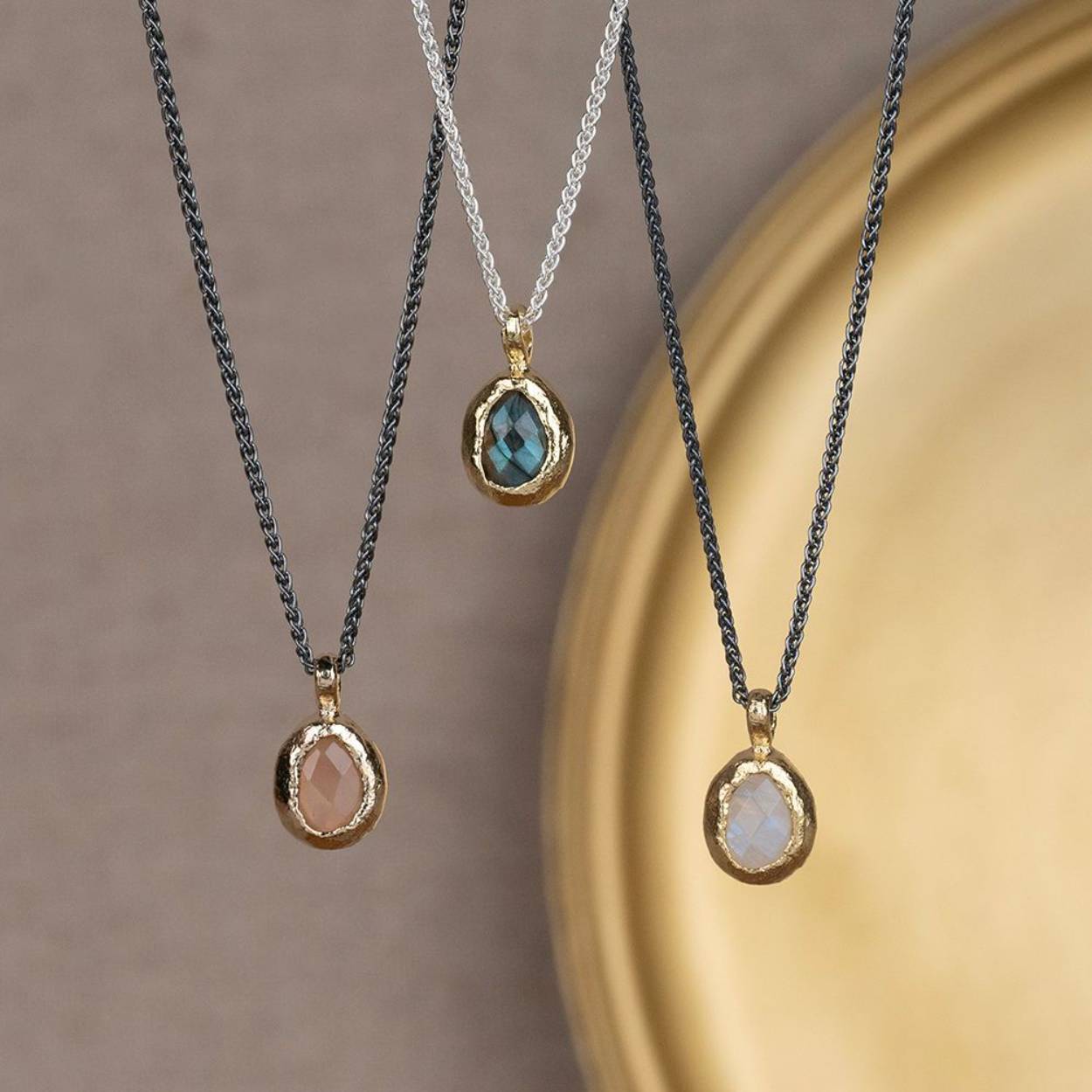 Collier gemaakt van 925 sterling zilver aan het collier hangt een gefaceteerde maansteen omsloten met zilver verguld.