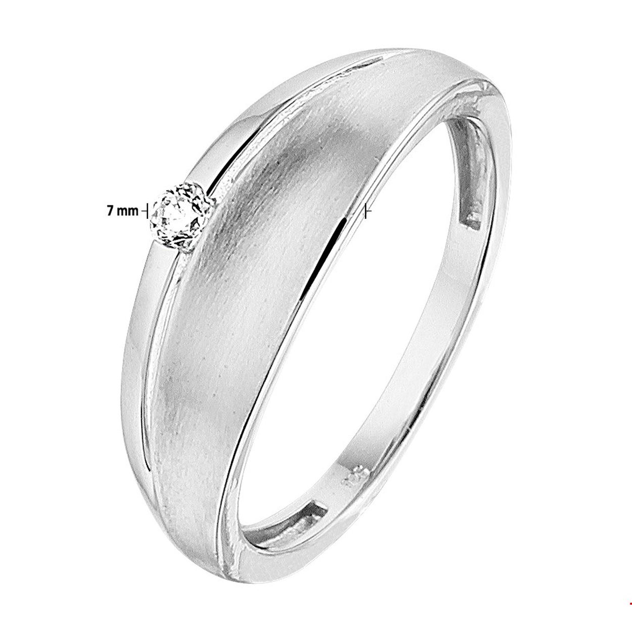 Gerhodineerd zilveren ring uitgevoerd met schitterende zirkonia. De ring heeft een breedte van 7mm. Info: Gerhodineerd zilver is door de rhodiumlaag beter bestand tegen verkleuren en krassen.