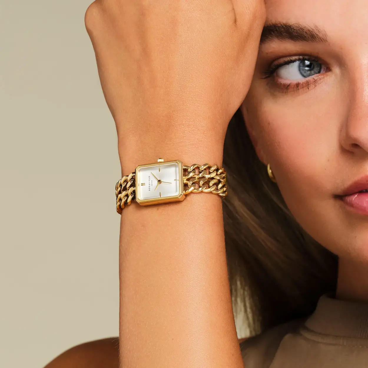 Studio introduceert een nieuwe stijl die een horloge en sieraden combineert – kleine maat, met een aanpasbaar dubbel plat kettinkje als bandje. Een uniek item met een premium uitstraling.