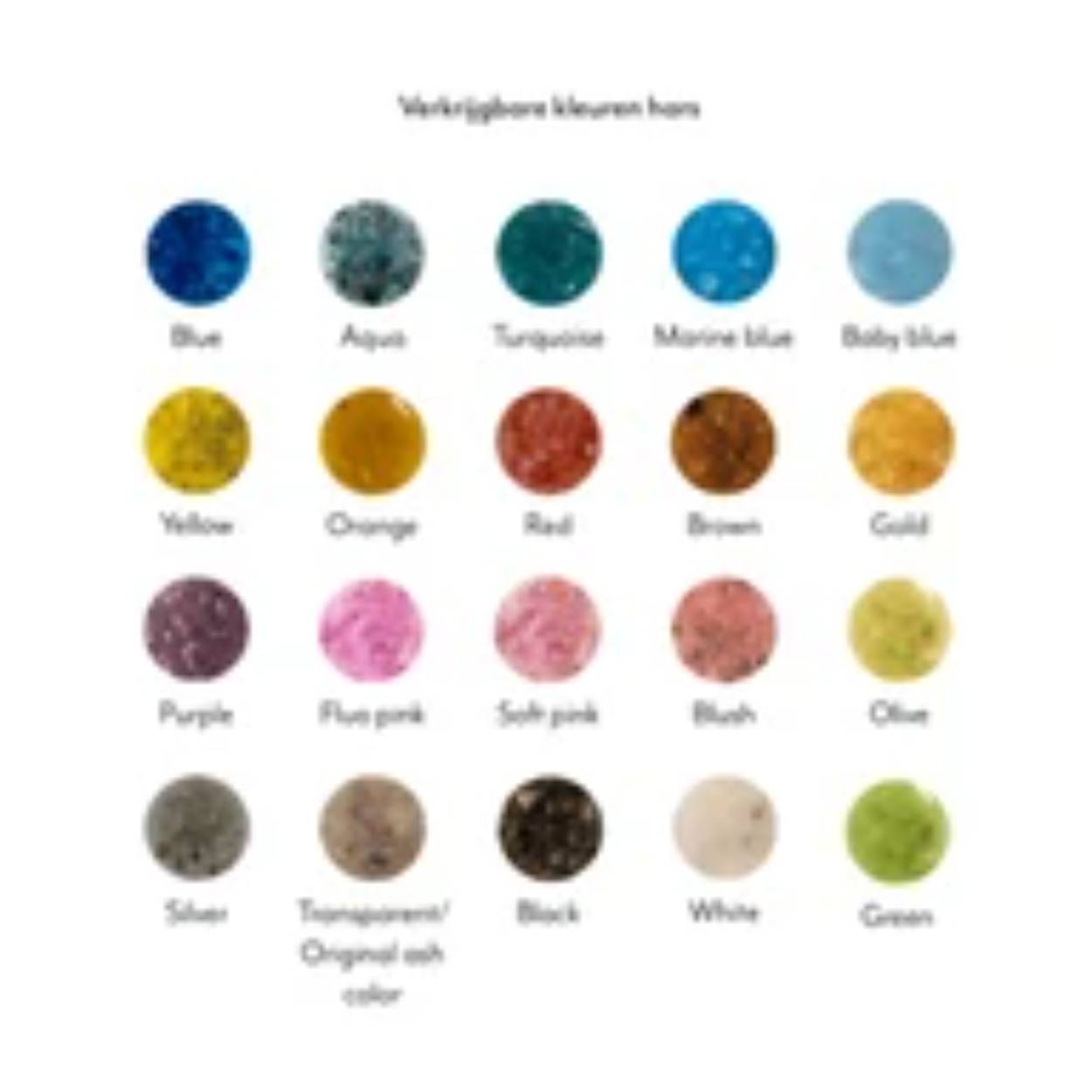 Je kunt dit sieraad in onze webshop bestellen. Je ontvangt bericht wanneer het sieraad bij ons in de winkel aanwezig is. Wij nemen dan contact op voor het maken van een afspraak. Je kunt bij het vulproces aanwezig zijn. Neem de as mee naar de afspraak. Een kleine hoeveelheid (slechts een paar theelepels) is ruim voldoende. Indien je aanwezig bent bij het vullen, heb je invloed op de kleur van de hars. Wij gaan deze samen met jou mengen tot de gewenste kleur. Indien je er liever niet bij aanwezig bent, mag je de as naar ons versturen of komen brengen. Wil je geen as, maar moedermelk in dit sieraad laten verwerken? De procedure is hierbij hetzelfde.