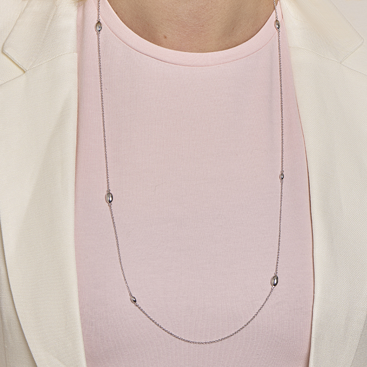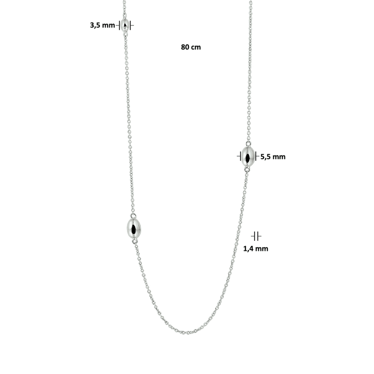 Trendy gerhodineerd zilveren anker collier met een draaglengte van 80cm.  De schakelbreedte is 1.4mm. Uitgevoerd met poli afgewerkte ovaaltjes met breedtes van 3.5 en 5.5mm. Het collier voegt een subtiele hoeveelheid glamour toe aan iedere outfit. Tip: Leuk om kado te geven! Info: Gerhodineerd zilver is door de rhodiumlaag beter bestand tegen verkleuren en krassen.
