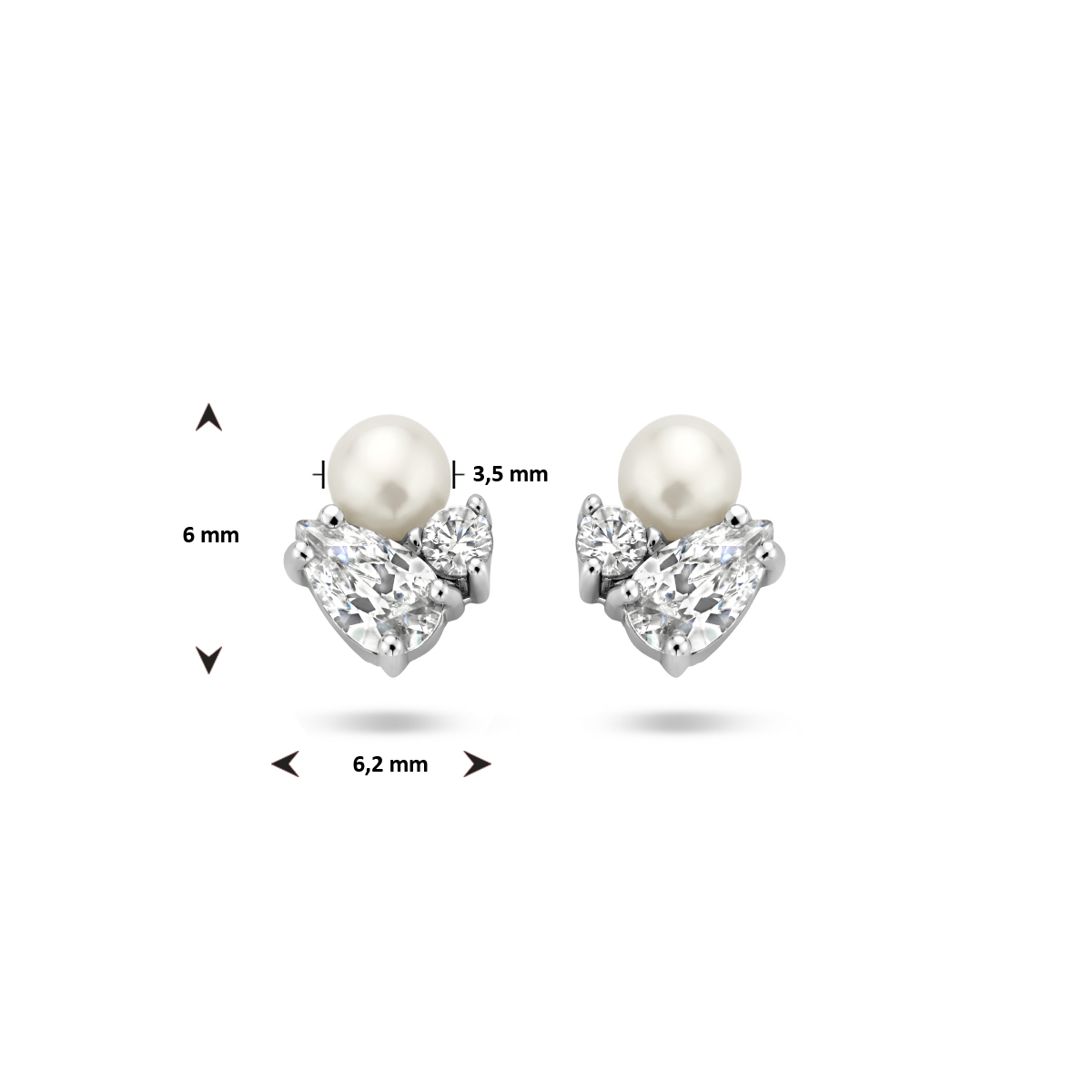 Gerhodineerd 925 zilveren oorknoppen uitgevoerd met schitterende zirkonia en een zoetwaterparel. De oorknoppen hebben een afmeting van 6x6.2mm.