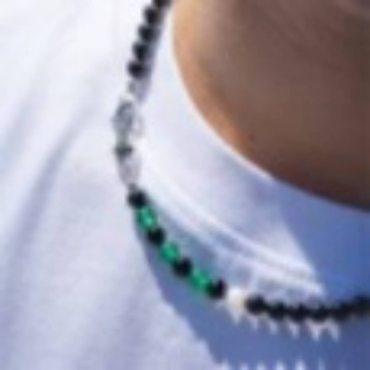 Een handgemaakte ketting met edelstenen, met zwarte onyx, witte maansteen, groene onyx en witte zoetwaterparels. Samen brengen ze kracht, sereniteit en tijdloze schoonheid om je te begeleiden op je levensreis.