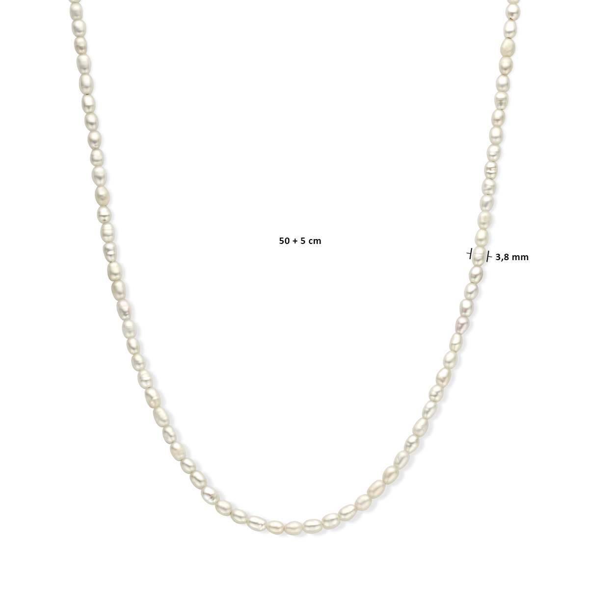 Het product "Zoetwater parel collier met zilveren sluiting 50cm", modelnummer 1338219, beschikt over een breedte van 3,8 mm en een glanzende afwerking. Draag deze elegante collier om je outfit te verfraaien voor een speciale gelegenheid of dagelijkse stijlverhoging.